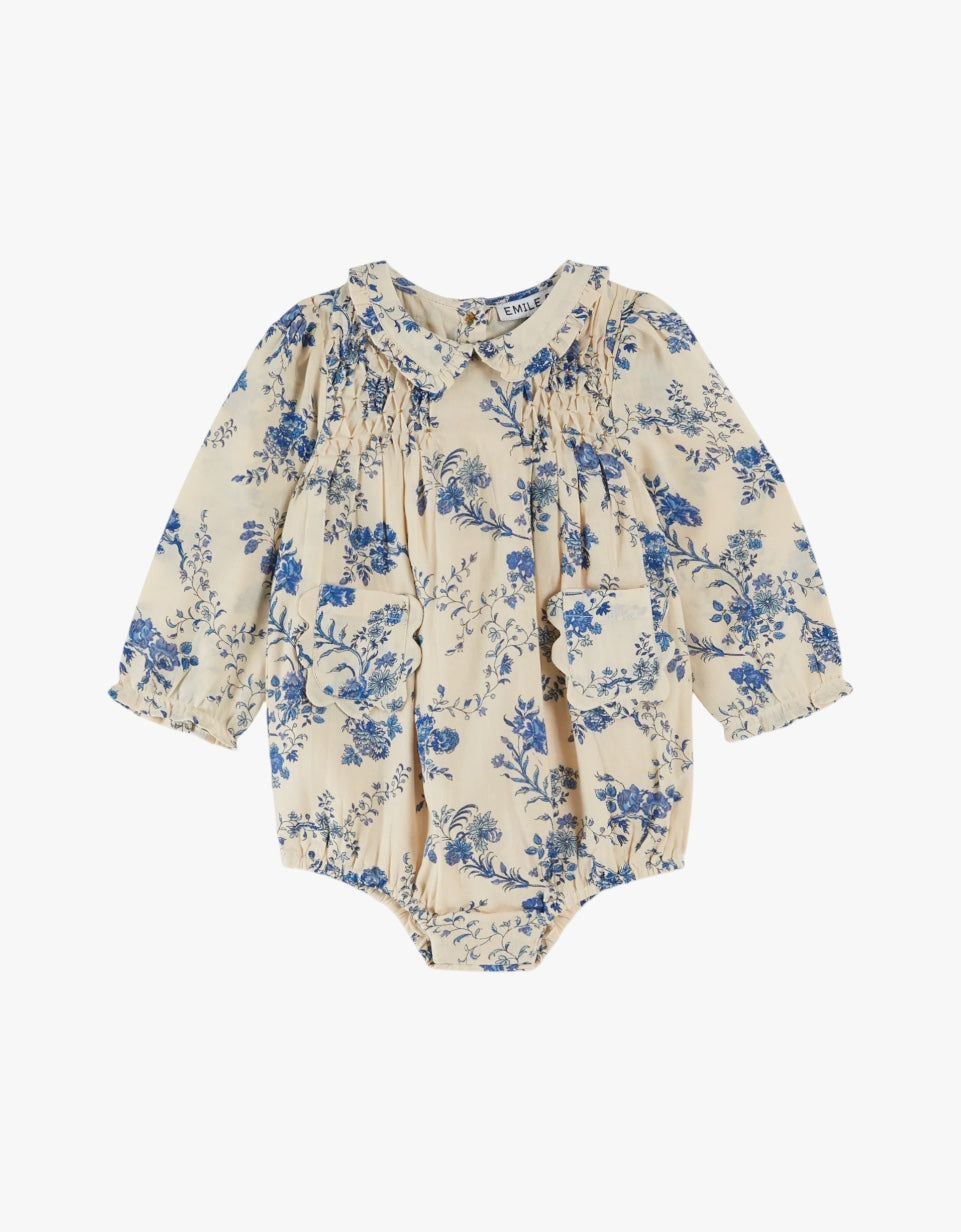 Macacão em algodão macio estampado com flores azuis sobre fundo cru.