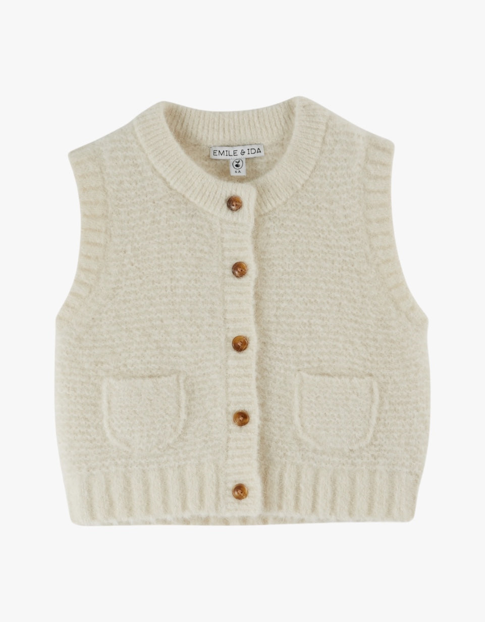 Casaco na cor cru, sem mangas, em lã de alpaca e misturas de lã de ovelha com certificação RWS, tricotado em ponto musgo.