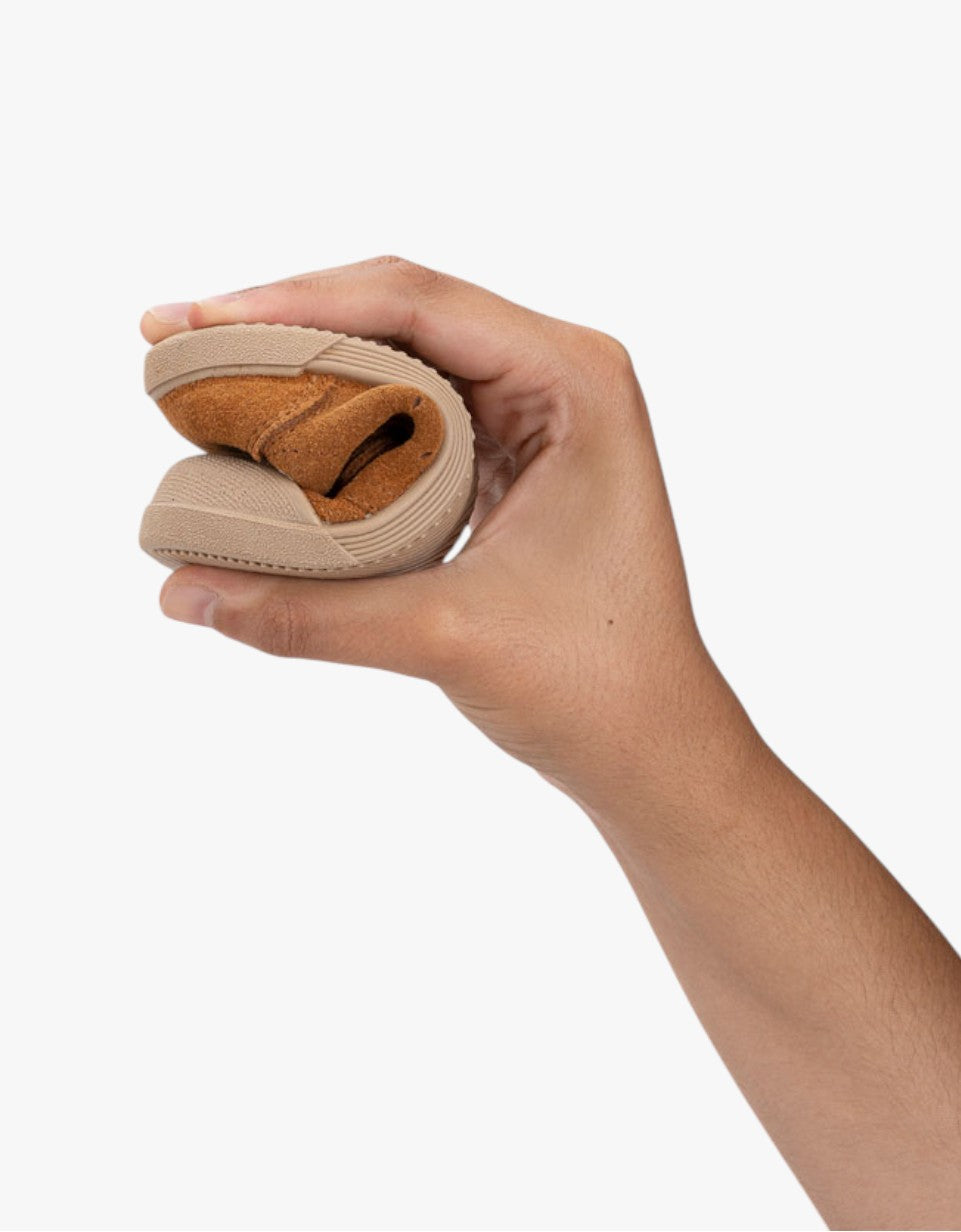 Sapatilha casual em camurça com conceito barefoot, flexível e macia, com palmilha removível e velcros para melhor ajuste e independência.
