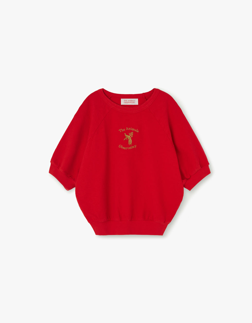 Top na cor vermelho com corte descontraído. Apresenta o logotipo da marca como uma espécie de insígnia exclusiva. Decote canelado e cava raglan. Fabricado com um tecido grosso 100% algodão.