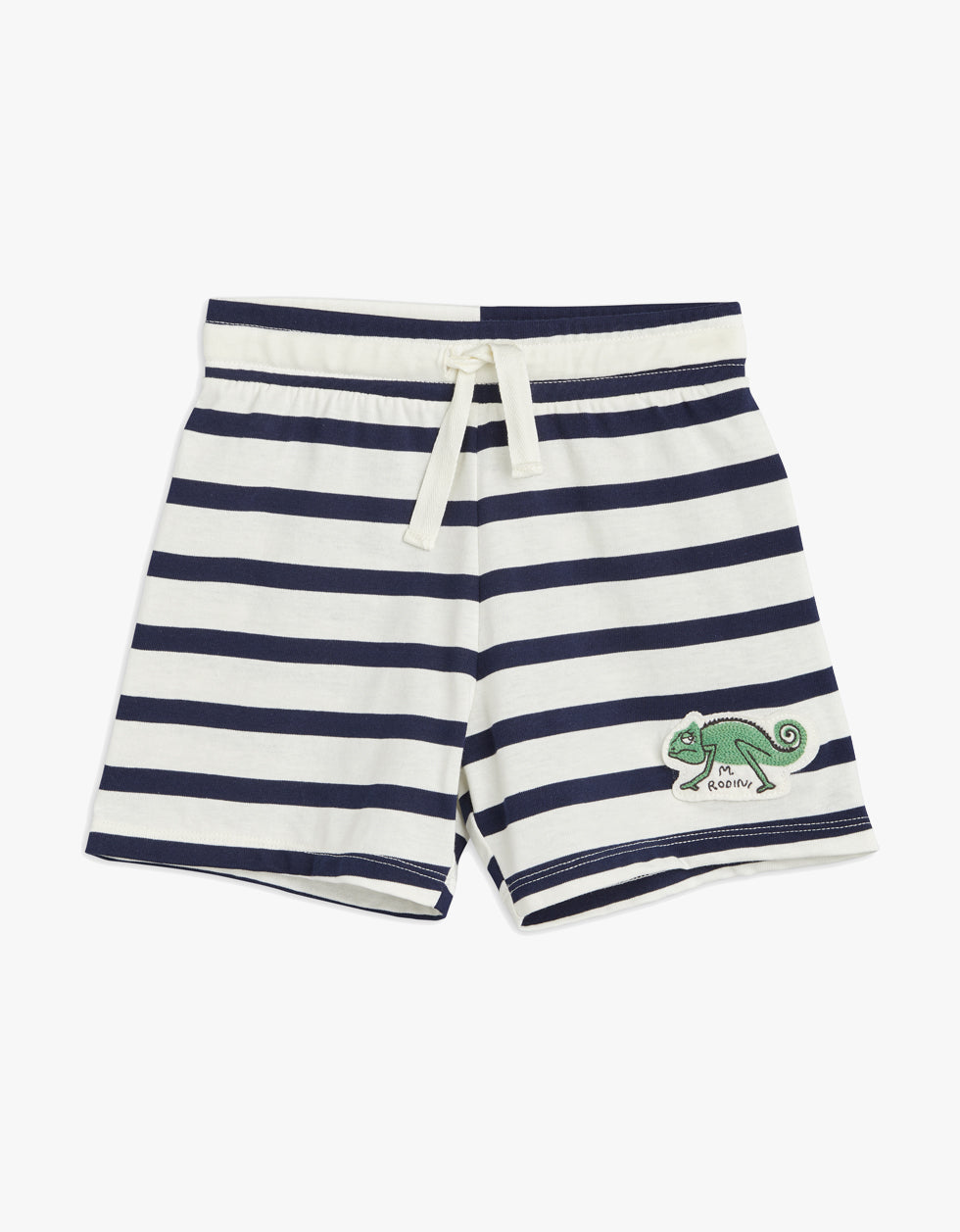 As riscas são um clássico! Calções às riscas decorados com um patch de camaleão bordado, fabricados com 100% algodão orgânico com certificação GOTS. Com cós elástico e cordão para os manter no lugar durante todo o dia.