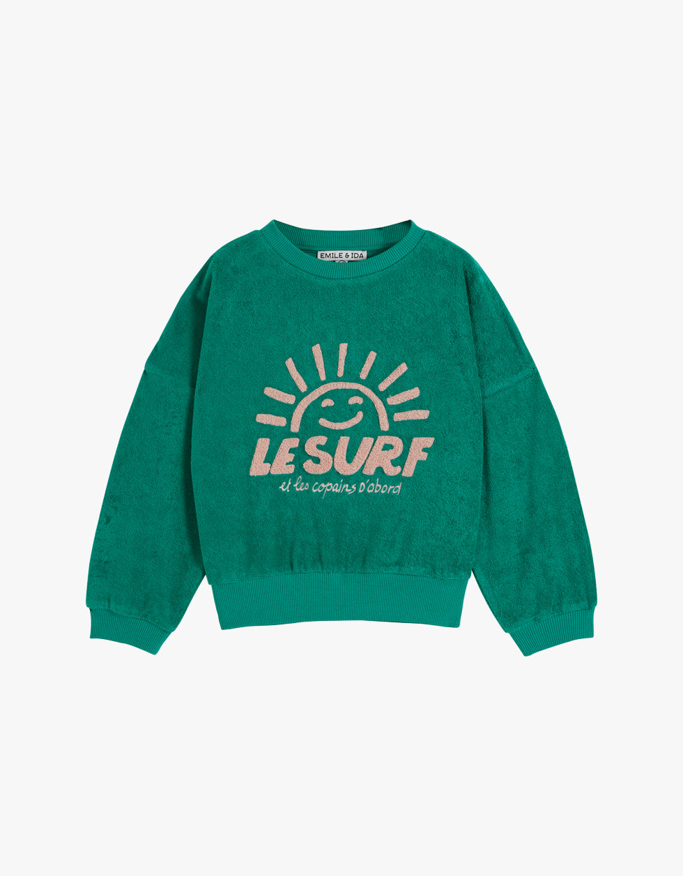 Sweatshirt in fuzzy cotton jersey, in green, with embroidery on the front. Very soft, fluffy, elastic and comfortable cotton and polyester blend. Long sleeves, round neckline, ribs on cuffs, neckline and hem. The embroidery highlights the sun and surf in pink!