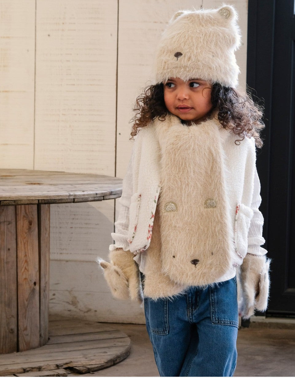 Agasalhe-se com o cachecol Teddy Bear Fluffy. Fabricado com o fio castanho-claro mais macio, com um lindo rosto bordado e orelhinhas brilhantes, este cachecol é também forrado com lã para maior aquecimento!