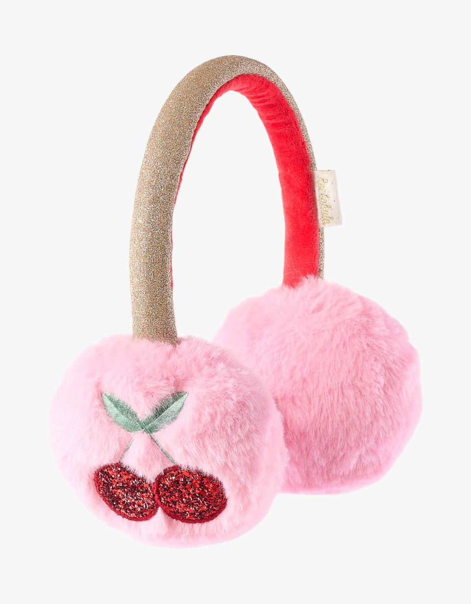 Mantenha-se colorida e aconchegante com estes divertidos tapa-orelhas! Fabricados com pelo rosa supermacio e detalhes de cereja doce. Uma bandolete ajustável e confortável coberta com glitter dourado torna-os perfeitos para este inverno!!