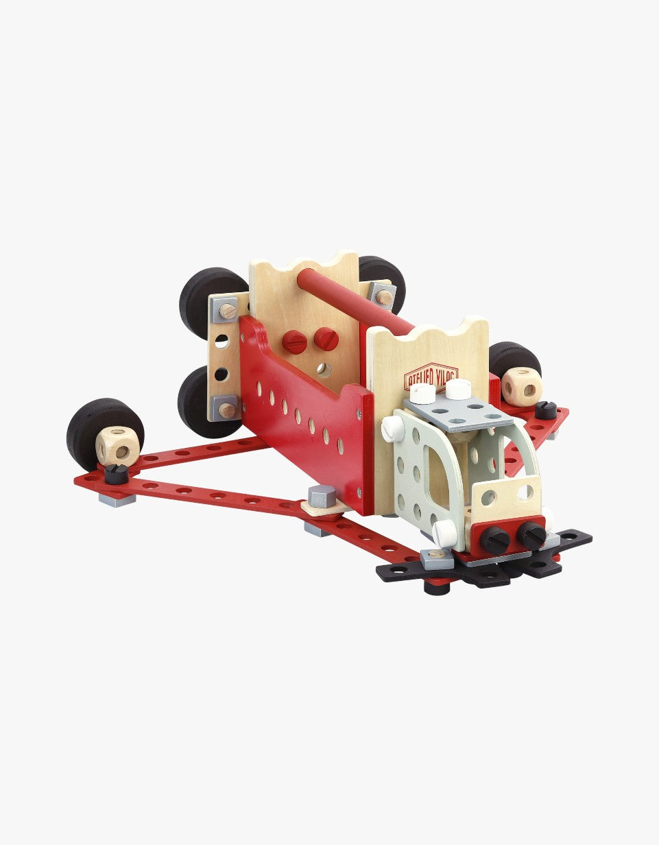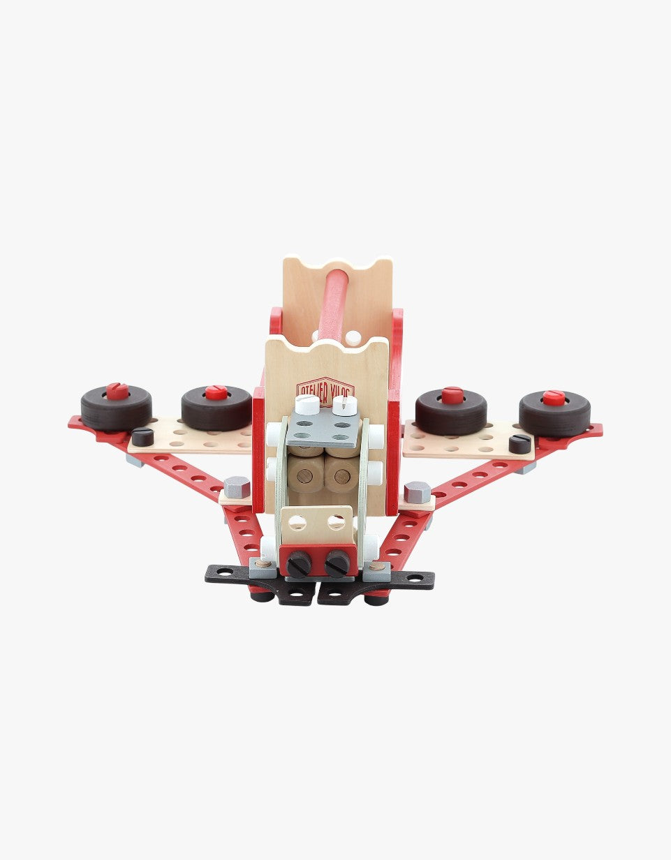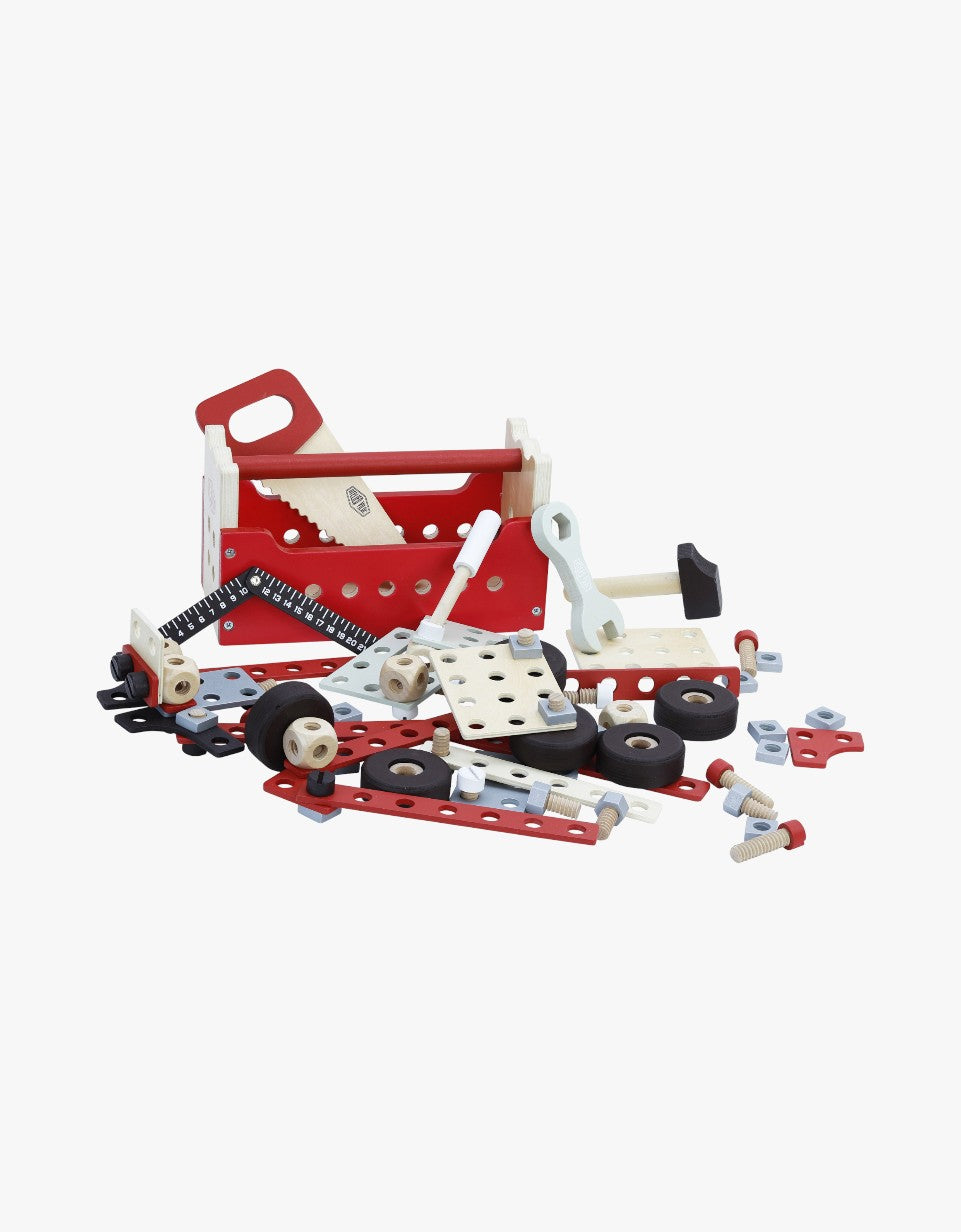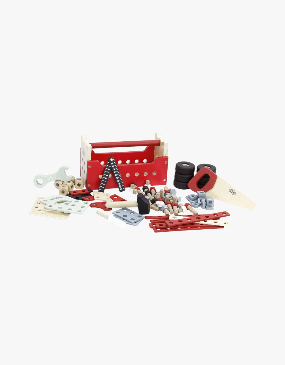• Diversos acessórios e ferramentas de madeira: martelo, serra, chave de fendas, chave inglesa, pregos, porcas, parafusos, tábuas perfuradas (96 peças no total).