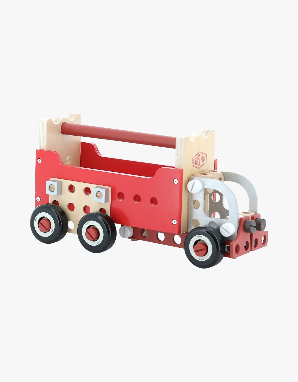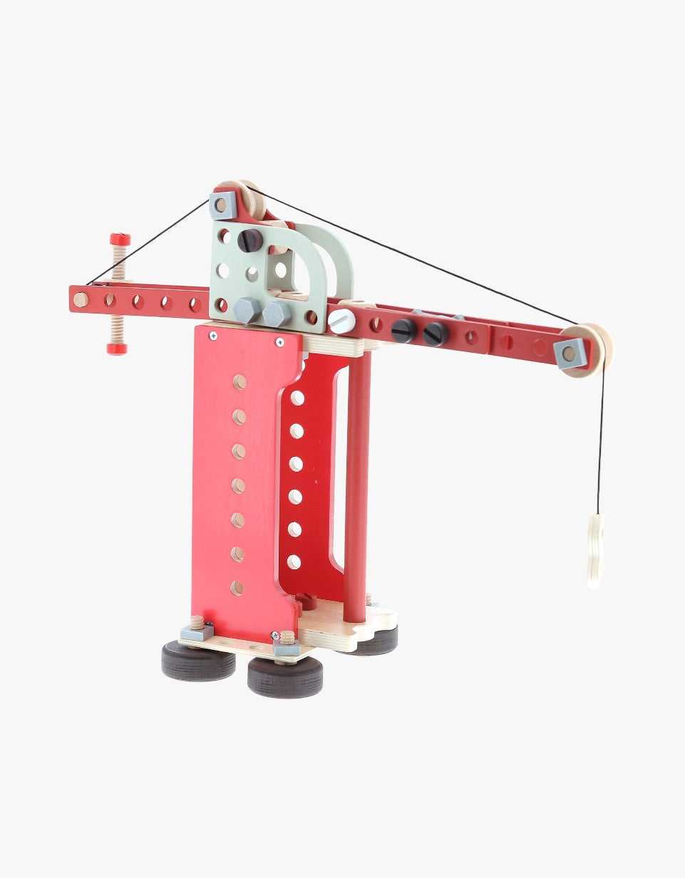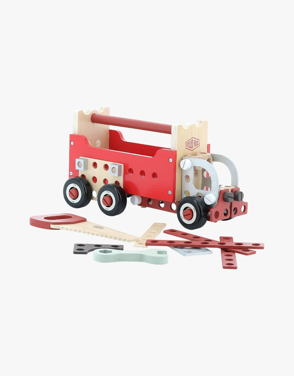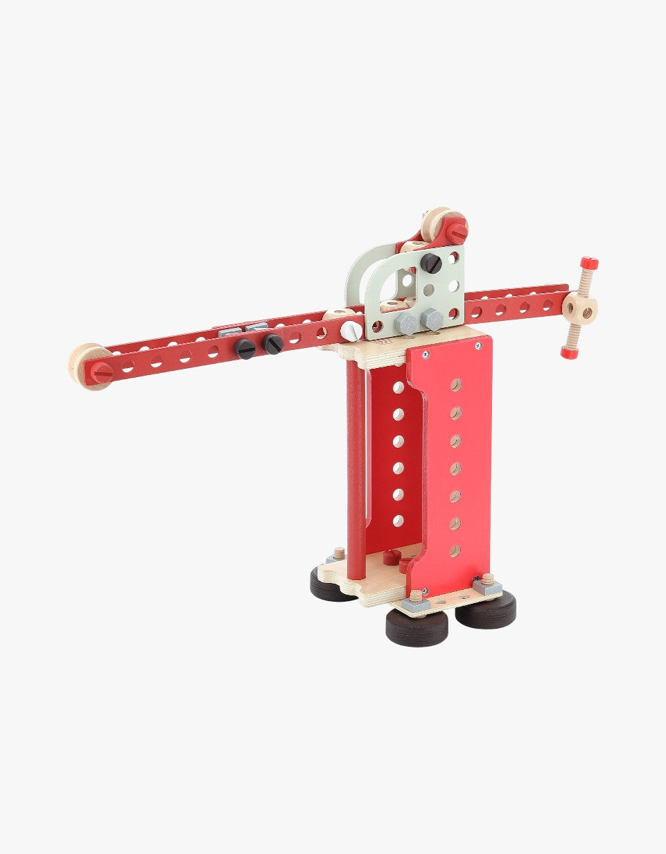 • Diversos acessórios e ferramentas de madeira: martelo, serra, chave de fendas, chave inglesa, pregos, porcas, parafusos, tábuas perfuradas (96 peças no total).