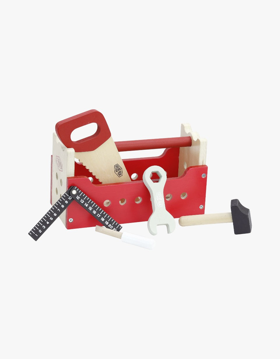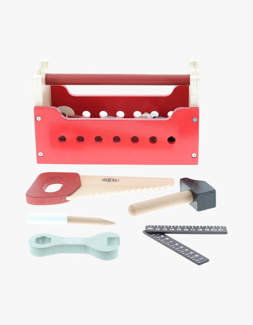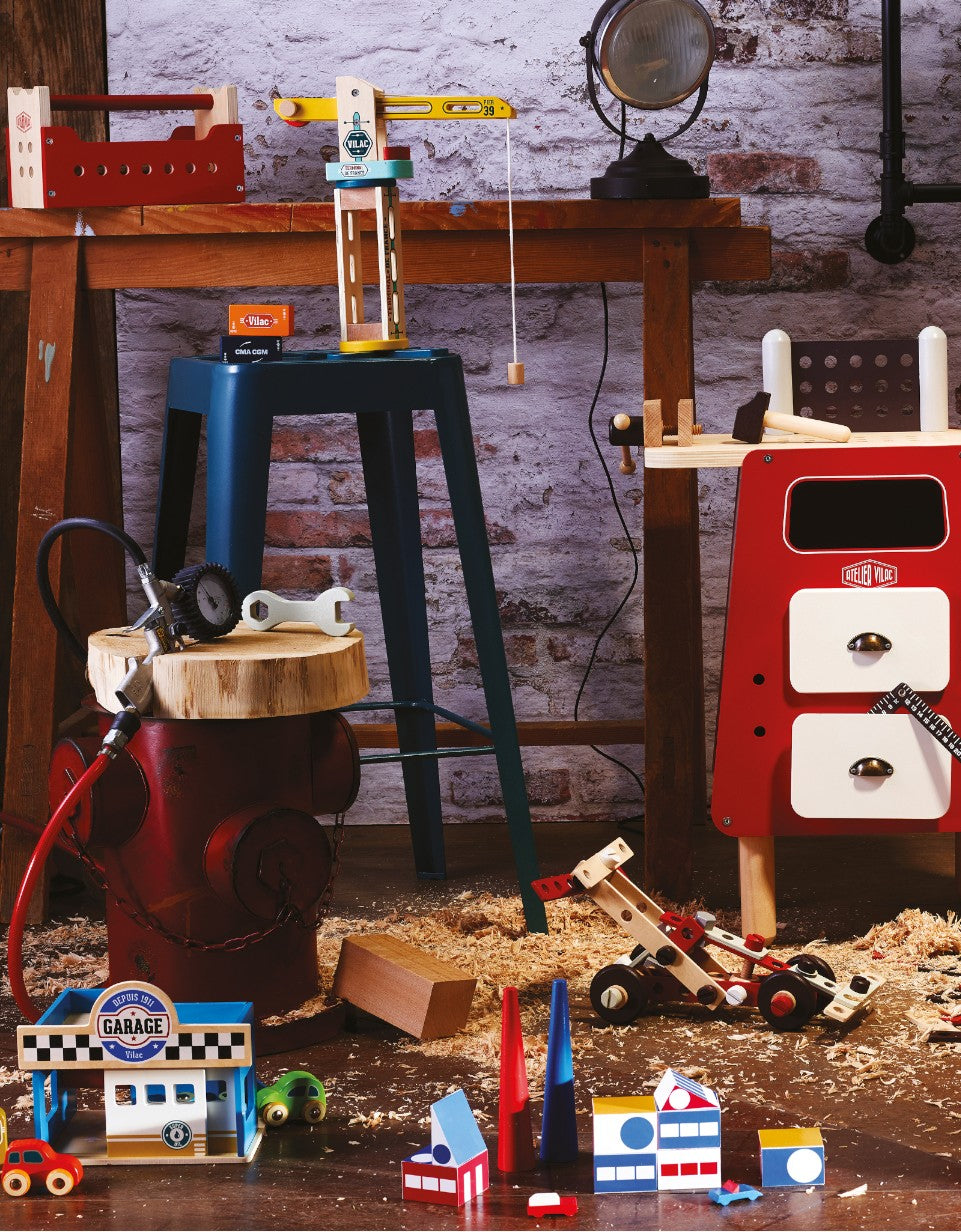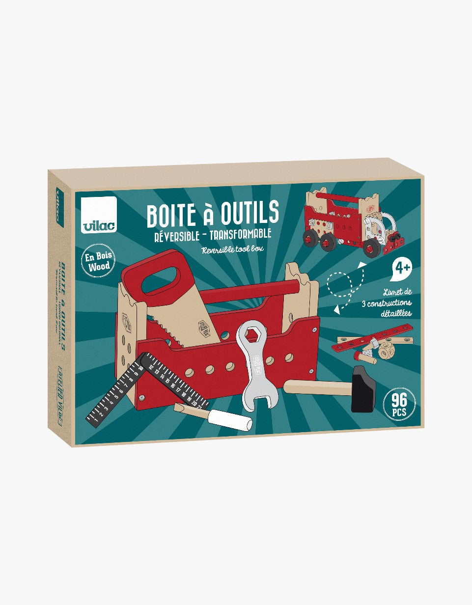 Bem-vindo à oficina da Vilac! Esta engenhosa caixa de ferramentas de madeira transforma-se numa bancada de trabalho quando virada. As crianças podem aparafusar, rodar, serrar, martelar e medir com todas as ferramentas, tal como os adultos. Ao montar porcas, parafusos e tábuas utilizando os modelos fornecidos, a caixa de ferramentas pode ser transformada num camião, numa grua, num robô e em tudo o mais que a imaginação da criança permitir.