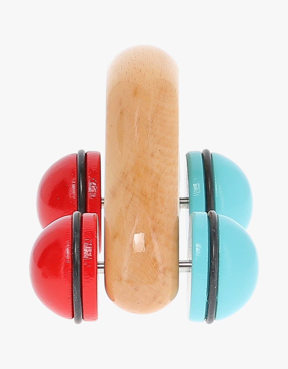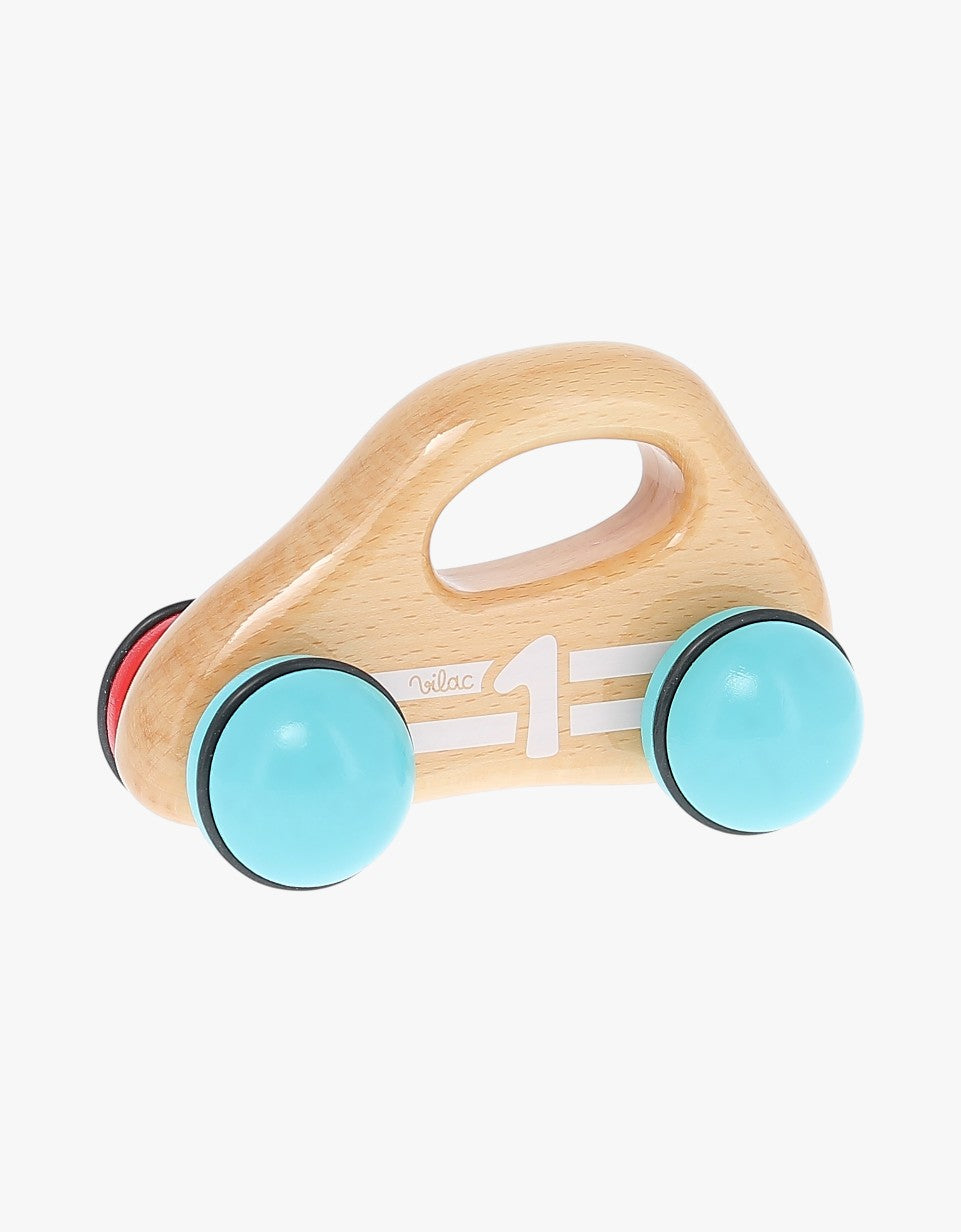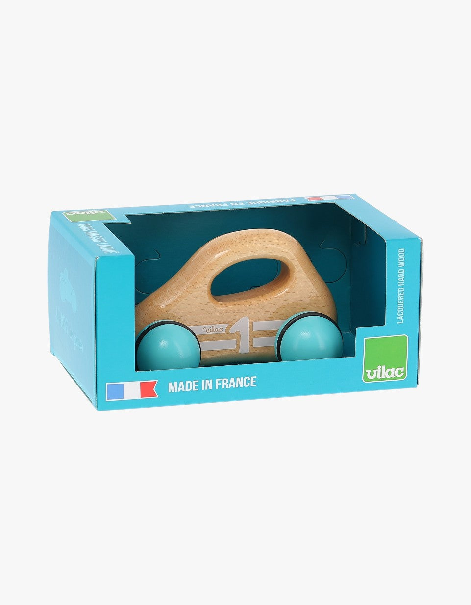 Primeiro carrinho de bebé em madeira natural envernizada. Jantes em dois tons de vermelho e azul. A partir de 1 ano de idade.