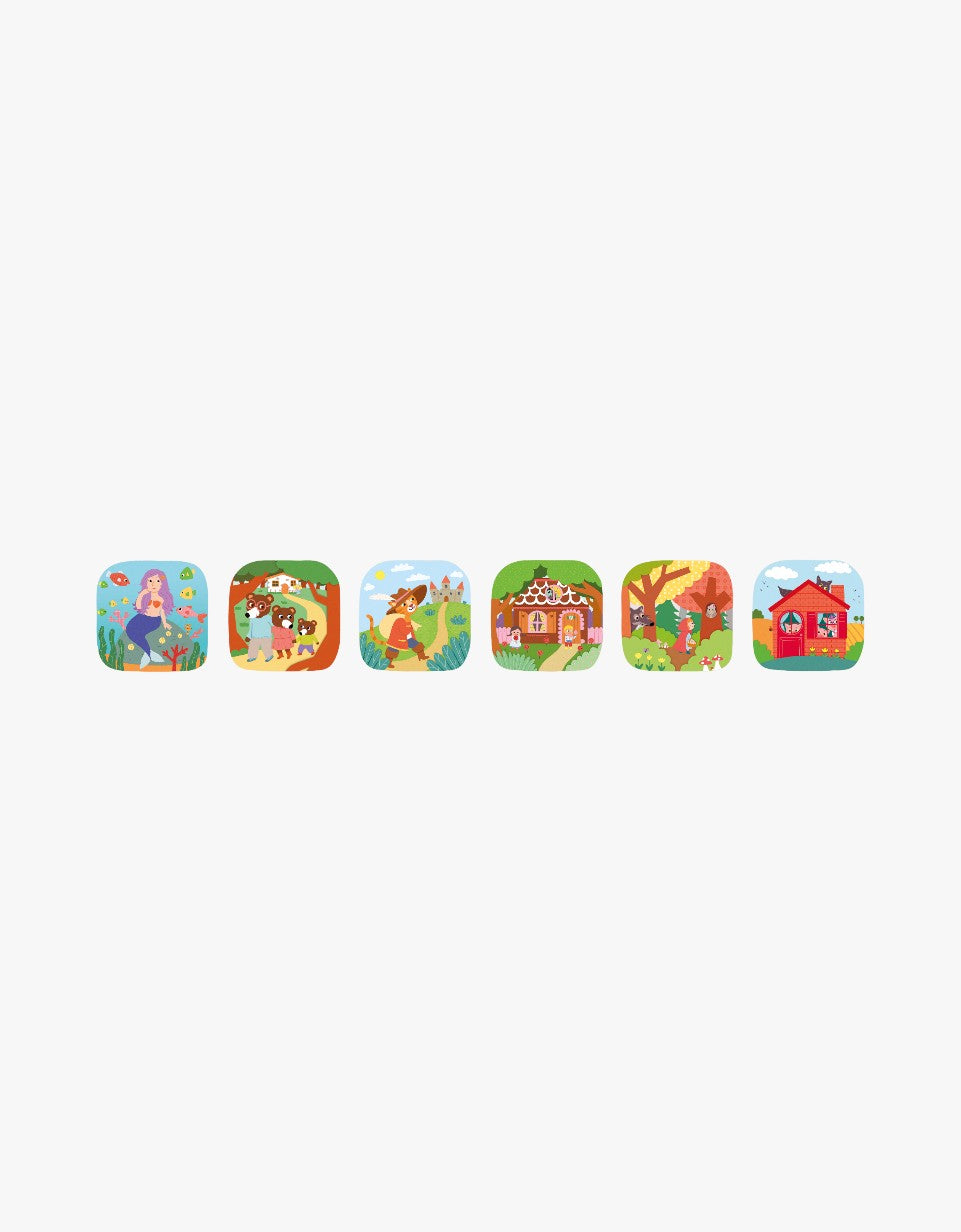 Cubos de madeira ilustrados e inspirados em contos de fadas icónicos. A Pequena Sereia, O Gato das Botas, Cachinhos Dourados e os Três Ursos estão entre as imagens a reconstruir.