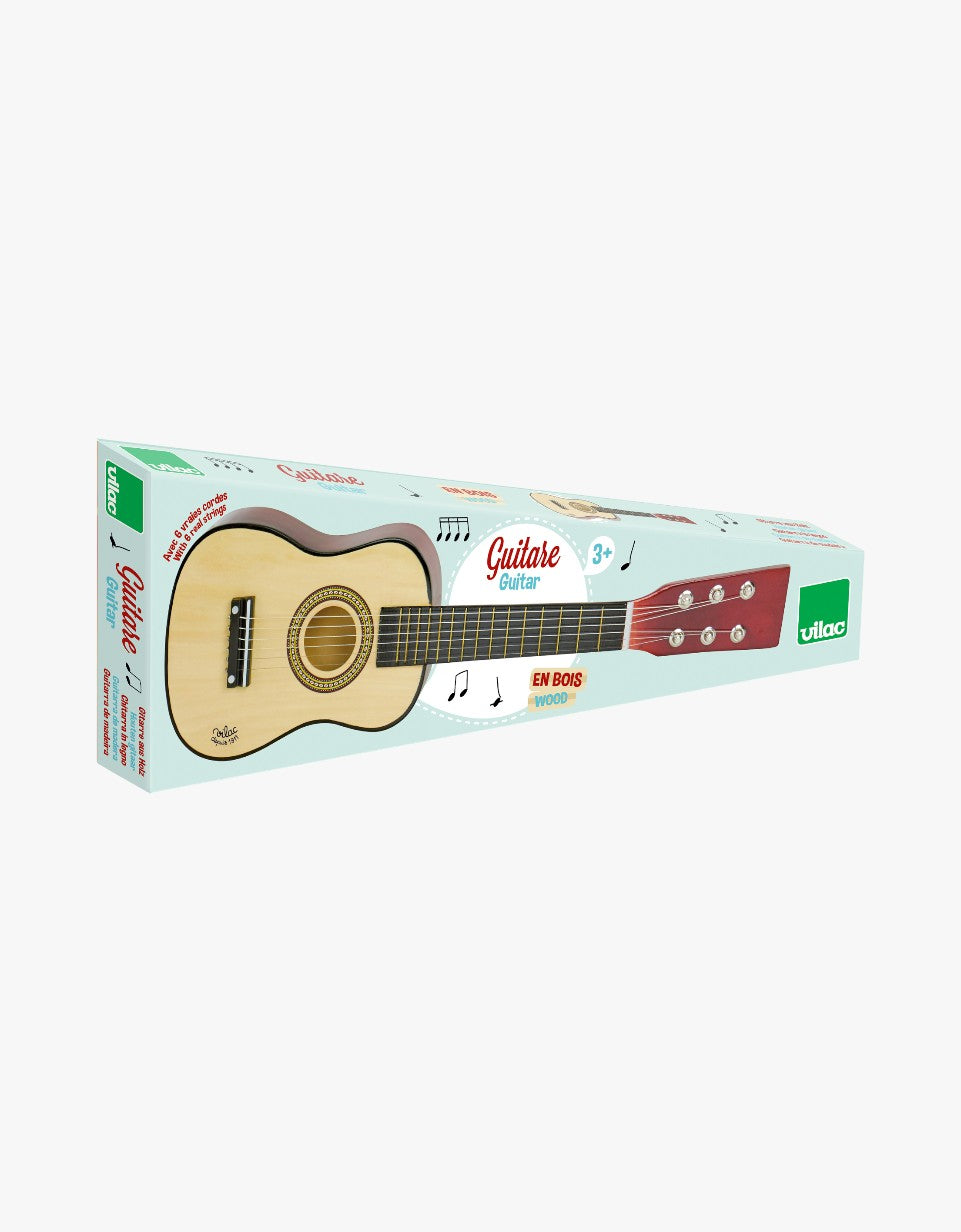 Mini guitarra clássica em madeira natural. Note que esta guitarra é um brinquedo de faz-de-conta. Vendida com um conjunto de cordas extra.