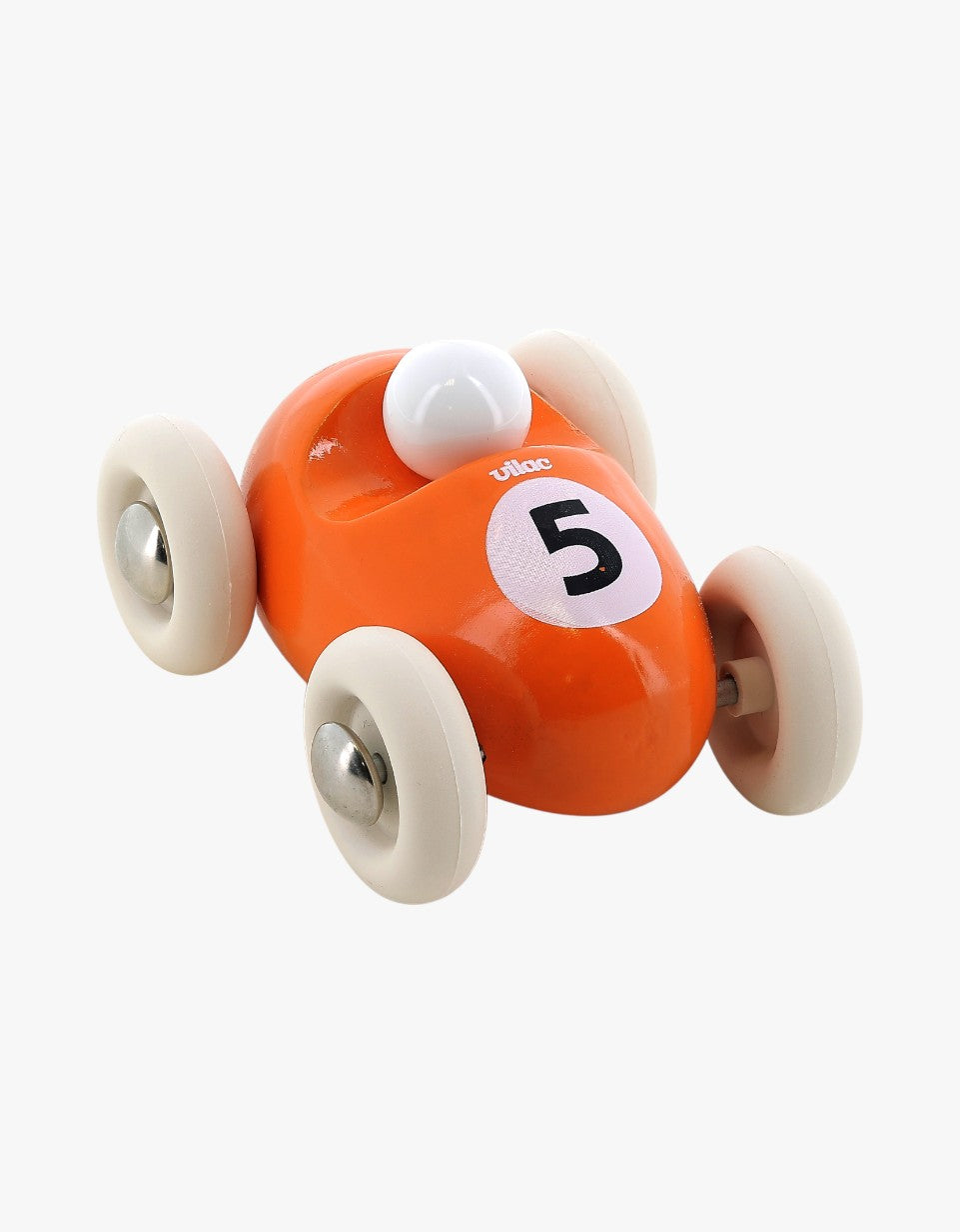 Este descapotável, disponível em diversas cores, foi criado e fabricado na oficina Vilac em Moirans en Montagne (Jura), com madeira de faia proveniente de florestas geridas de forma sustentável. Cada carrinho de corrida com a inscrição "Made in France" foi decorado com verniz brilhante, inofensivo para as crianças.