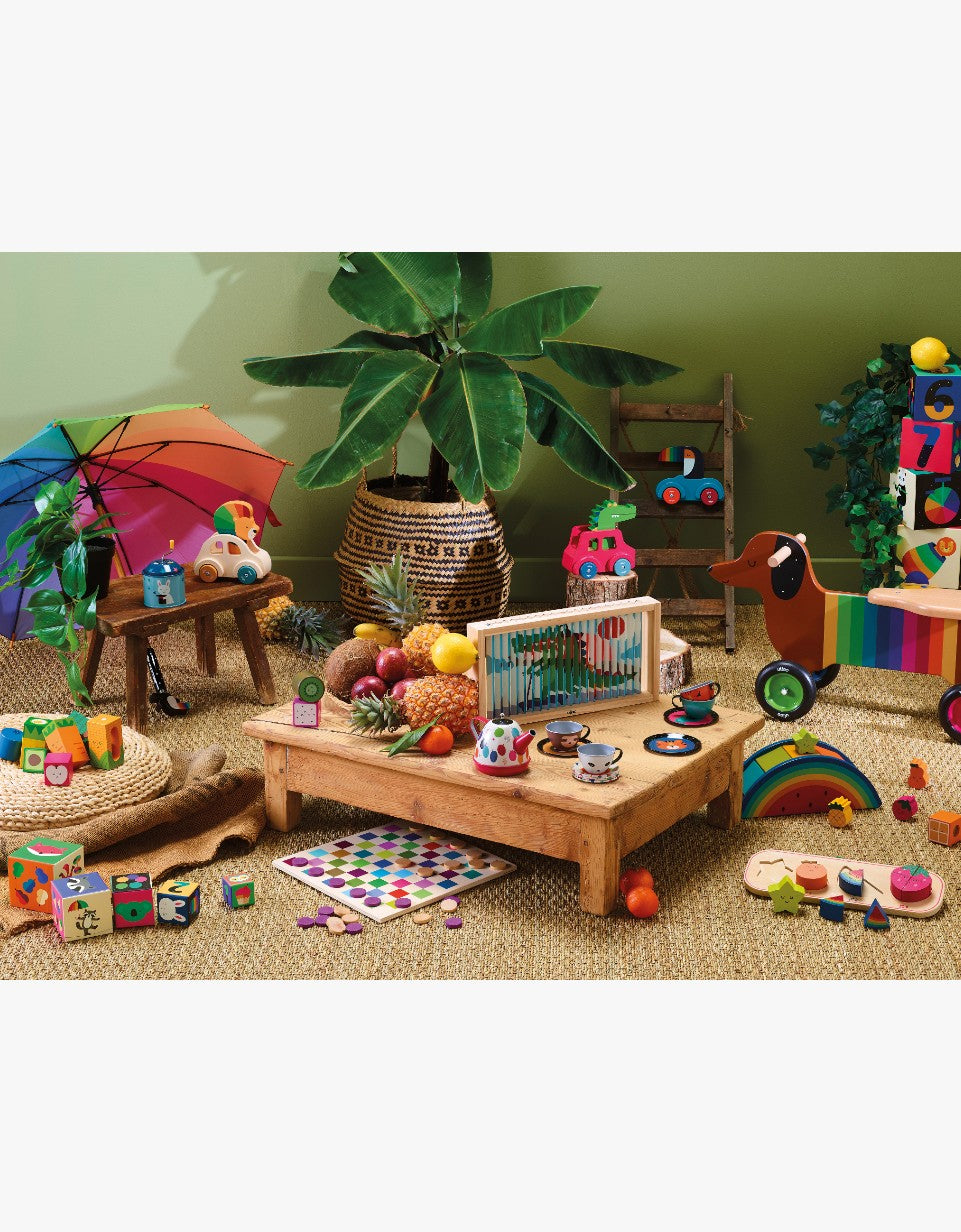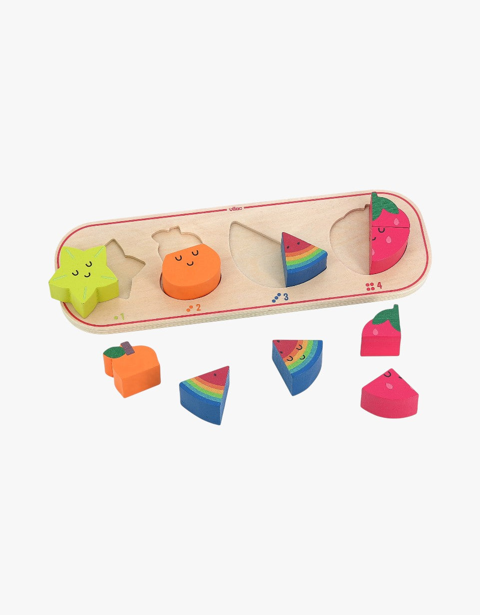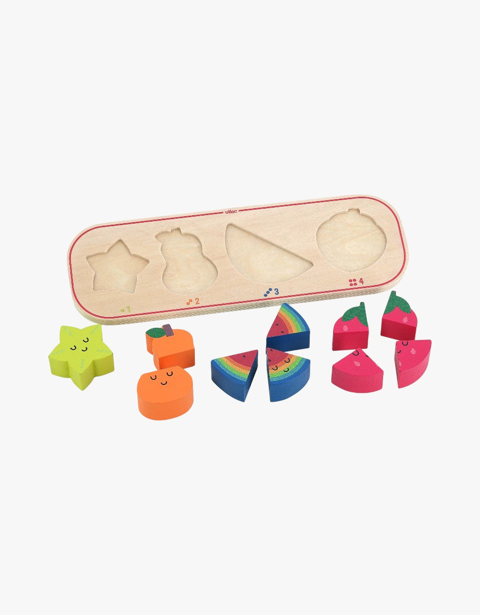 As crianças a partir dos 18 meses vão divertir-se com este primeiro jogo educativo. As frutas têm formatos e cores diferentes e permitem testar associações e empilhamento, introduzindo os pequenos aos números e ordens de grandeza. Todos os elementos são colocados num suporte de madeira. Para facilitar o armazenamento, o suporte é recortado de acordo com o formato das frutas e, em cada compartimento, os designers acrescentaram o número correspondente à quantidade de peças, bem como uma indicação visual. Este jogo educativo em madeira oferece um espaço de aprendizagem dinâmico e divertido, onde as crianças exploram alegremente o mundo dos números (e das frutas).