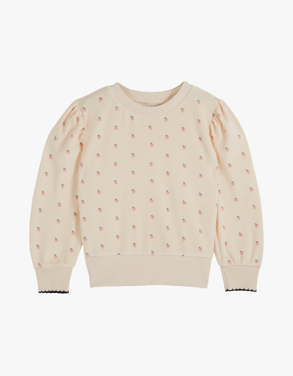 Sweatshirt em jersey felpudo de algodão e polyester, na cor cru, estampada com pequenos corações cor-de-rosa. Manga comprida, decote redondo, nervuras no decote e na bainha.